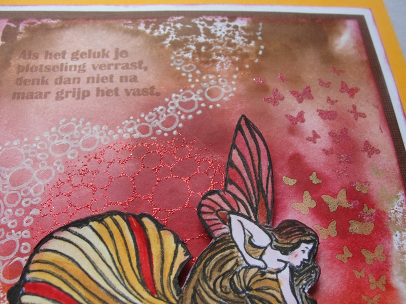 Hier is mijn eerste kaart als Gastdesigner en deze is gemaakt met een leuke stempel van Fantasy plate 26 van KiCoStamps. De achtergrond heb ik gemaakt met de techniek "Stempelen met een acrylblok". Zie uitleg technieken. Ik heb de Big & Juicy Foliage gebruikt. Dit geeft weer een apart en verrassend effect. Dus ook in deze kleuren verder gewerkt. Op de achtergrond met rode Sparkle embossingpoeder structuur gemaakt en de vlindertjes met embossingpoeder rose, wat glitter poeder en okergeel geƫmbost. Met witte Sakura gelpen wat gedoodeld (getekend). De tekst ook van de tekst plate nr. 2 met Archival Brown erop gestempeld. Tot slot de vlindermeisje met Stazon zwart gestempeld en ingekleurd in bijpassende kleuren. Uitgeknipt en verhoogd gemat. | | | | | | | | | | | | | | | | |