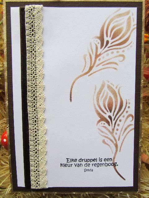 Vorige week heb ik met Kimara op de beurs gelopen (weer eens wat anders dan op een beurs staan) en terwijl ik wachte op Kimara want die was bezig met een armband maken. Zag ik deze stempel van Stampotique (ik verkoop hem dus NIET) en op slag verliefd, die moest ik hebben. Ik heb hem toen gekocht en deze kaart mee gemaakt.