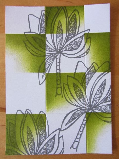 Ga dit nu sponsen. Dit kan met diverse soorten inkt, denk aan Brilliance, Distressinkt maar ik spons ook met Archival, hier de kleur Fern Green (nwe kleur) gebruikt. Dus keus zat. Ook kunt u zelf kiezen welke sponsjes u gebruikt. Ik gebruik mijn eigen sponsjes, maar vingersponsjes of de distresstool van Ranger zijn ook goed.